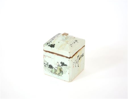 Scatola da tè decorata in policromia con personaggi ed iscrizioni (difetti) Cina, sec. XX