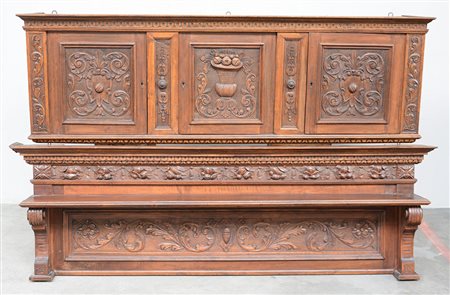 Due alzate in noce intagliate a volute vasi e stemmi, di cui una a tre sportelli, misure diverse (difetti)
