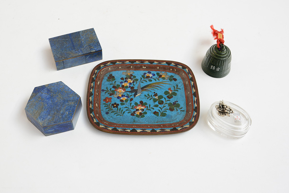 Lotto composto da un piatto in metallo cloisonné due scatole rivestite in lapislazzuli, un cristallo ed un campanello in metallo (difetti)
