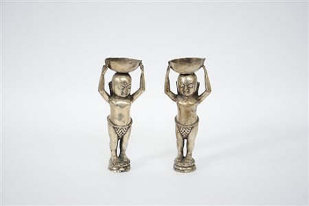 Coppia di figure orientali porta incenso in metallo argentato (difetti)(h. 21 cm.)
