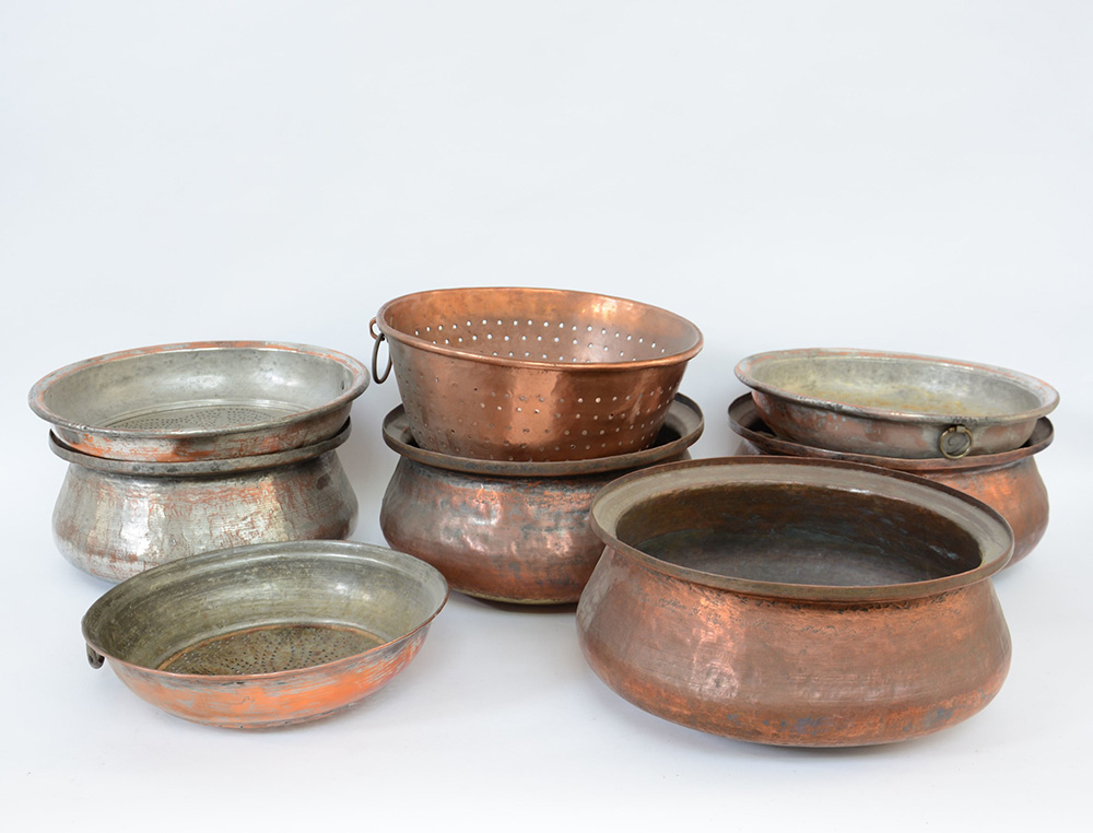 Lotto composto da quattro contenitori quattro setacci in metallo e rame (difetti)