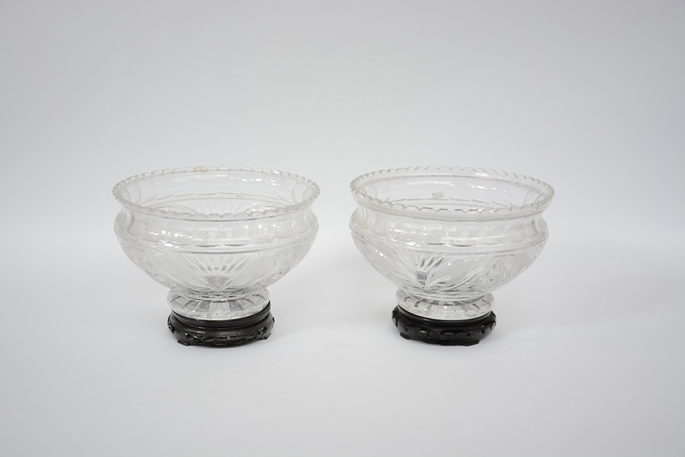 Coppia di alzate in cristallo molato a motivi stilizzati, con base in legno...