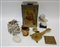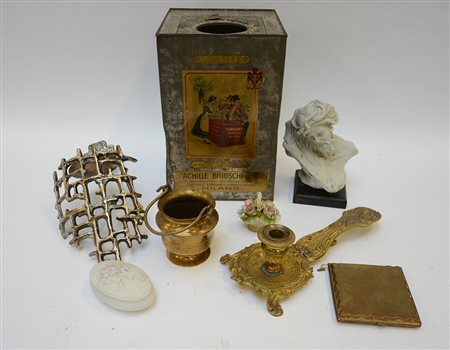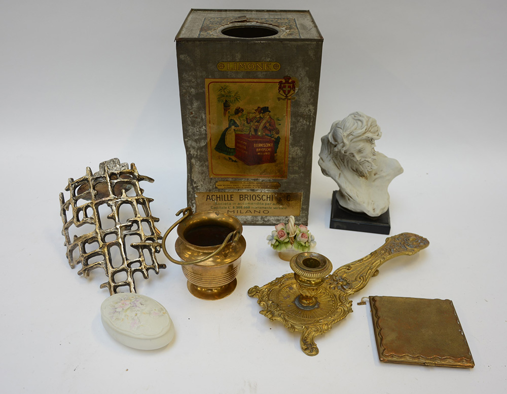 Lotto composto da una scatola in latta, un portaceri, una bugia e cinque oggetti di diverse epoche e materiali (difetti)