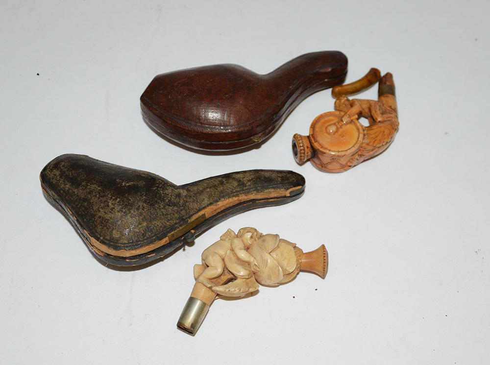 Lotto composto da due pipe in schiuma con decori diversi contenute in custodie originali (difetti)