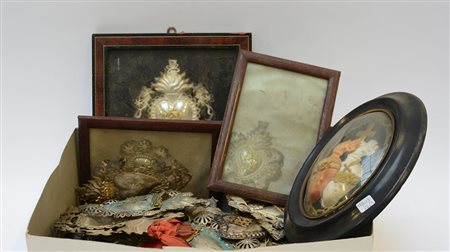 Lotto composto da una scatola contenente numerosi ex voto uniti a quattro cornici diverse (difetti)