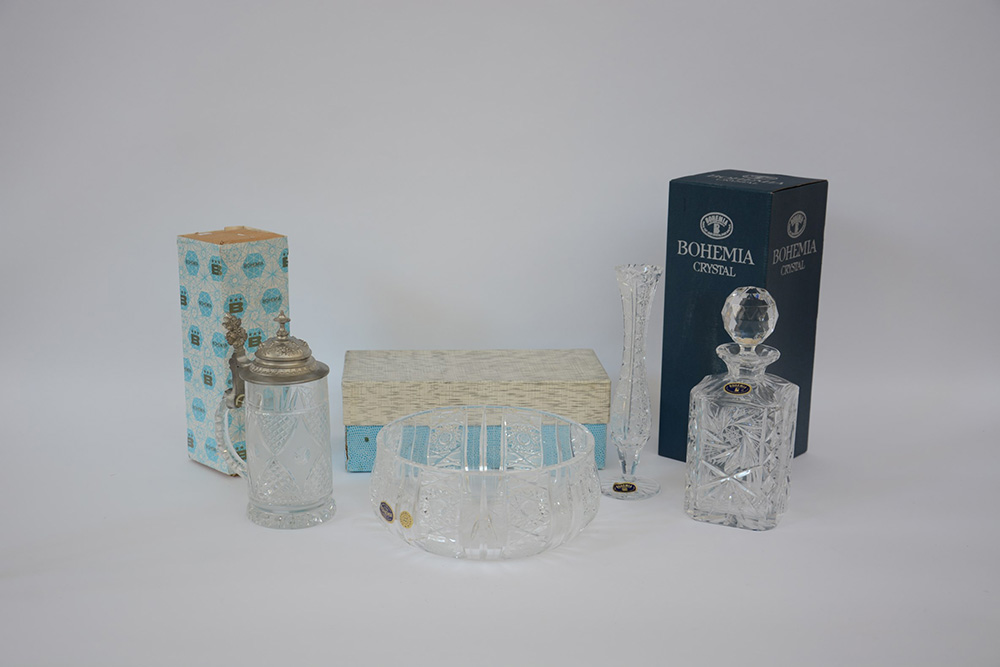 Lotto composto da quattro oggetti in cristallo di diverso uso, in custodia (difetti)