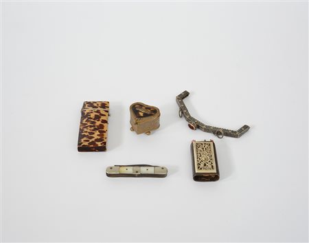Lotto composto da una scatolina a forma di cuore in metallo cesellato e (finta) tartaruga, un portafiammiferi in cuoio ed avorio inciso e traforato e un contenitore in avorio lastronato, una chiusura da borsetta in argento cesellato e pietra dura e un coltellino con manico in madreperla, sec. XIX -XX (difetti e mancanze)