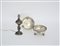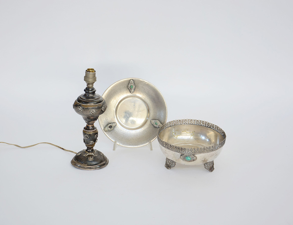 Lotto in argento composto da una ciotola tripode traforata, un piattino decorati con applicazioni floreali e pietra dura e un lume (h. lume cm 15 ca.) (gr lordi 530 ca.) (difetti)