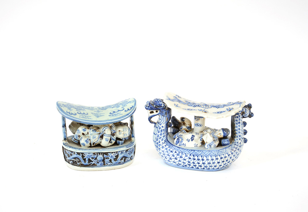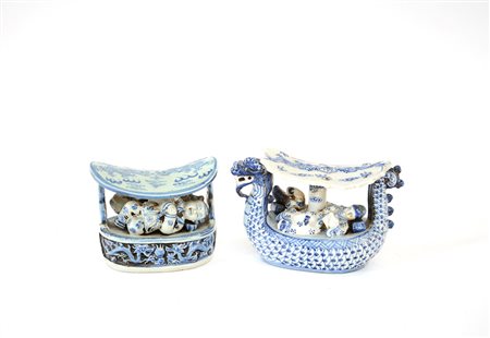 Lotto composto da due poggiatesta in porcellana bianca e blu decorati con draghi (difetti) Cina, sec. XX (l. max 23 cm.)