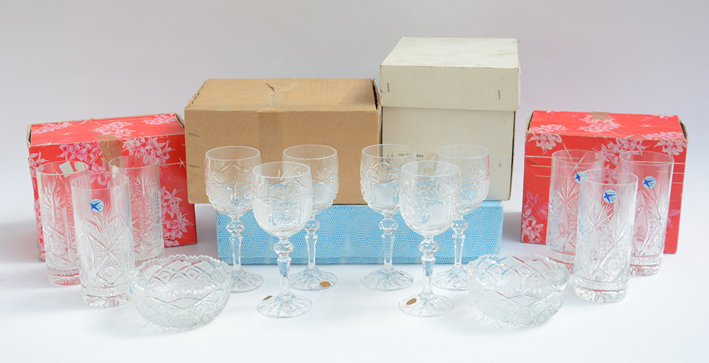 Manifattura di Boemia. Cinque scatole contenenti bicchieri in cristallo di...