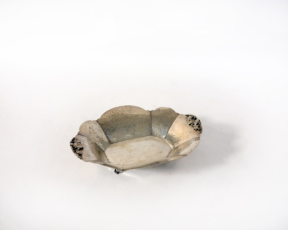 Vassoio in argento di forma rettangolare sagomata ed applicazioni con superficie martelé (cm 25,8x20,5) (gr 300 ca.) (lievi difetti)