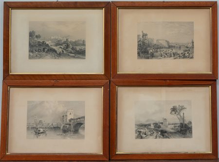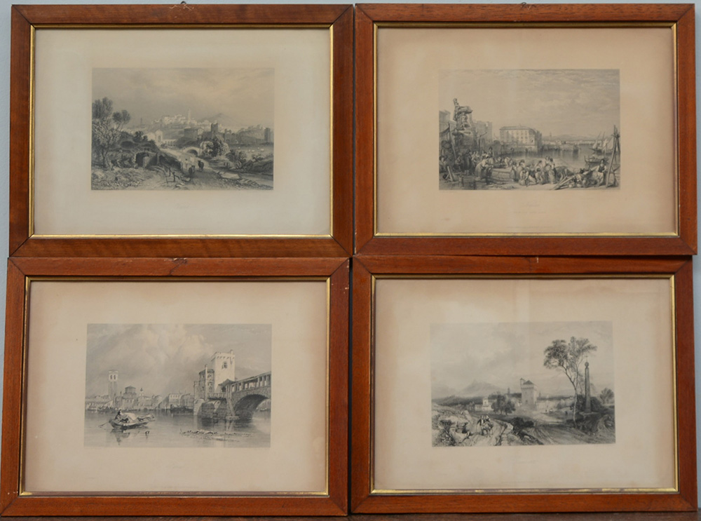 Lotto di due cartoni contenenti ventotto incisioni inglesi raffiguranti città e paesaggi italiani, in cornici (difetti)