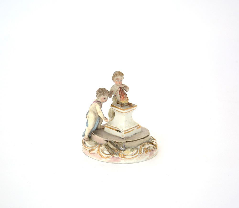 Manifattura di Meissen, piccola scultura in porcellana raffigurante due fanciulli intorno all'ara (h cm 8,5) (difetti e restauri)