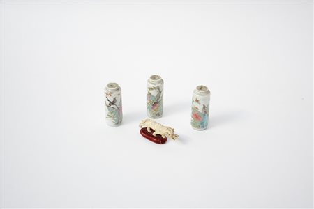 Manifattura orientale, lotto composto da tre vasetti in porcellana decorati con fiori e uccelli (h cm 8,5) e una piccola scultura in avorio raffigurante una belva con la preda (l cm 8) (difetti)
