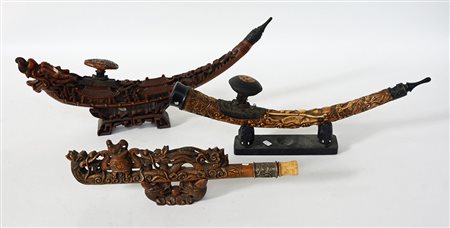 Lotto composto di tre pipe di manifattura orientale in osso, resina e legno, con supporti, di decoro e misure diverse (difetti)