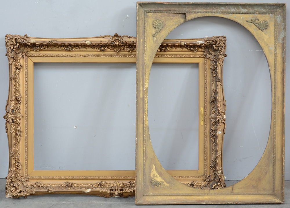 Lotto composto da due cornici rettangolari in legno e pastiglia, decorate a fiori e volute (difetti e mancanze)