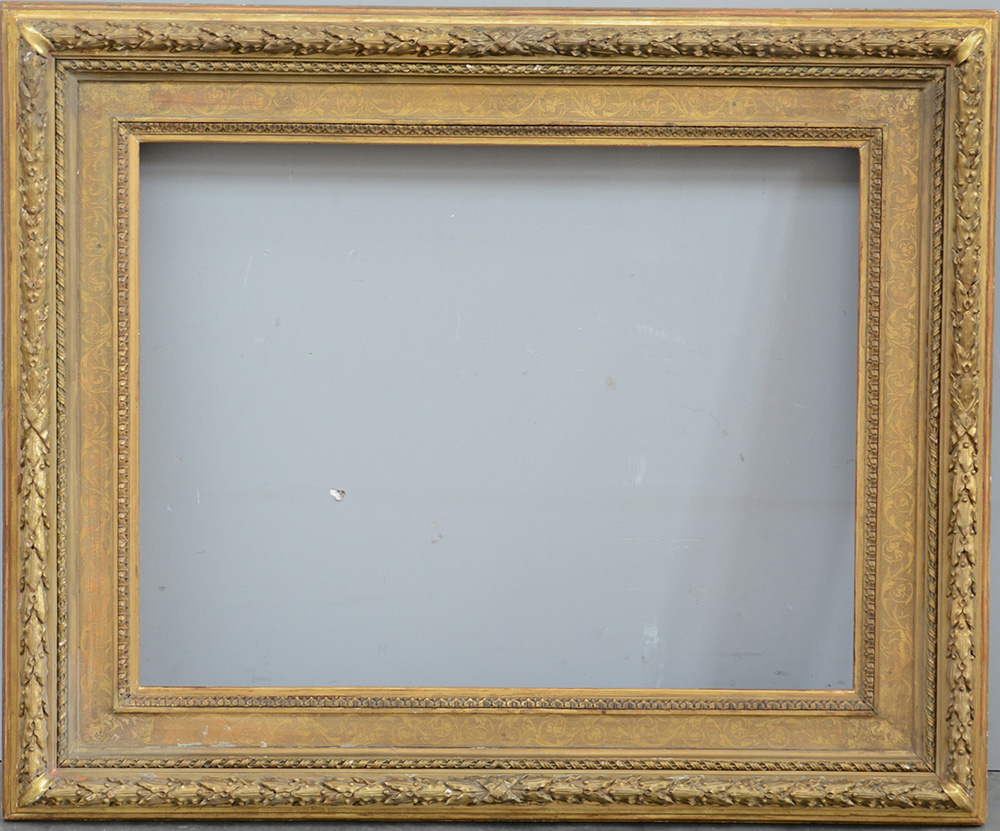 Cornice rettangolare in legno dorato e bulinato, decorato a motivi vegetali e volute. Sec. XIX (cm 82x63) (difetti)