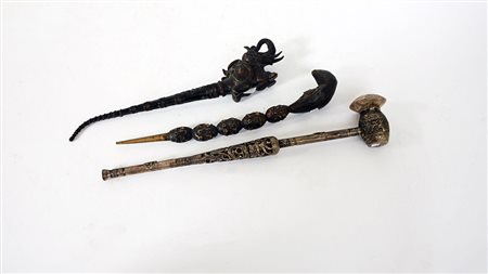 Lotto composto di tre pipe di manifattura orientale in metallo e metallo...