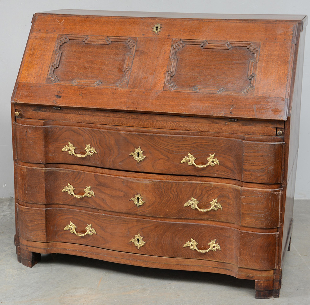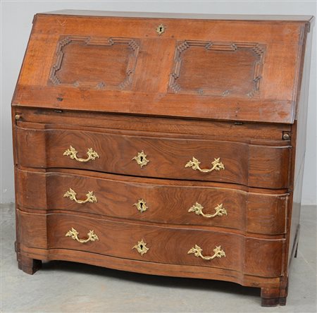 Ribalta con fronte mosso a tre cassetti con anta ribaltabile celante cassettini. Sec. XIX (cm 120x113x60) (difetti e restauri)