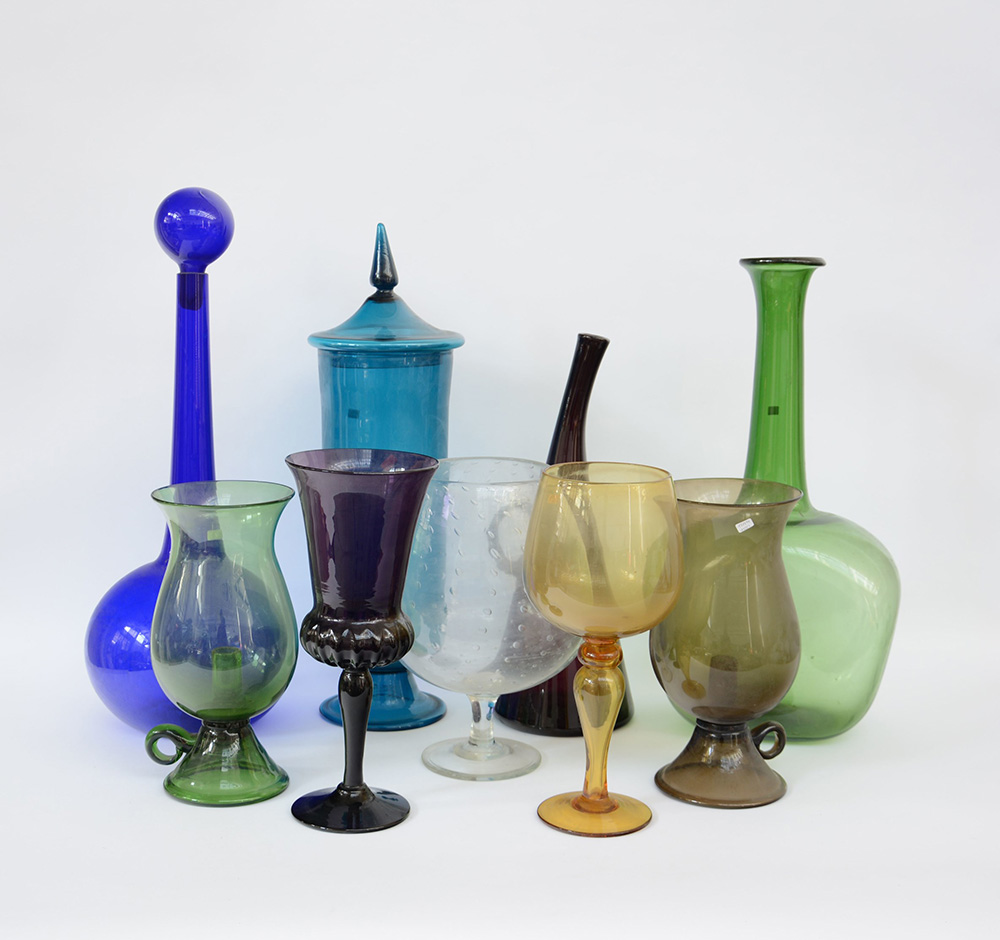 Lotto composto da un vaso con coperchio, due porta candele, tre bottiglie e tre coppe in vetro di diversa manifattura e decoro (difetti)