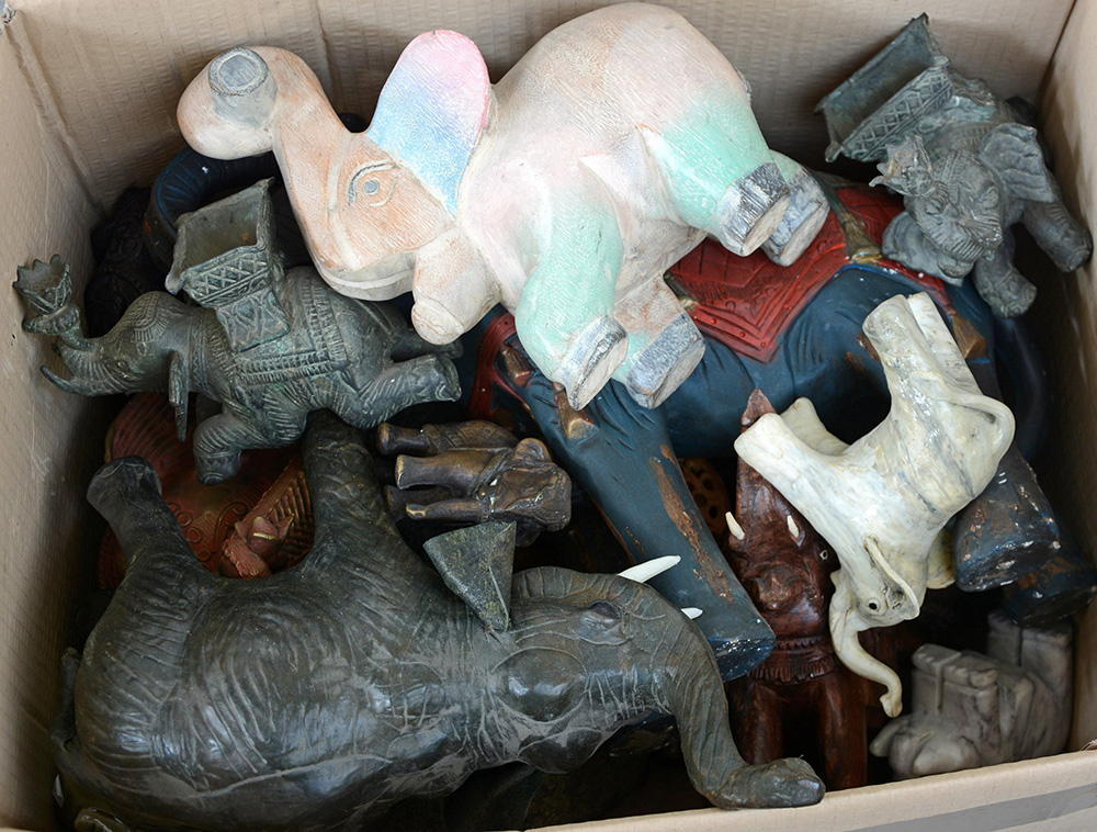 Cartone contenente numerosi elefanti di materiali diversi
