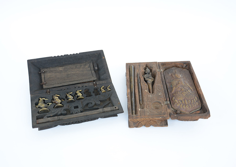 Due set da scrittoio di foggia orientale contenute in scatole di legno (difetti)