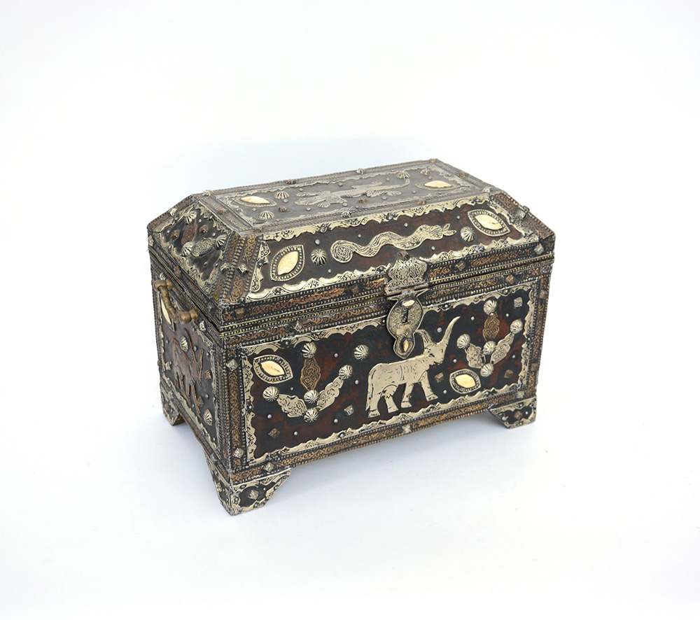 Bauletto con coperchio di foggia orientale in legno e metallo con inserti in osso (difetti) (50x40x30 cm.)