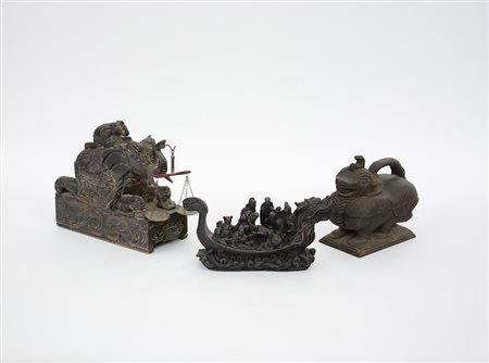 Lotto composto da tre sculture di foggia orientale in legno e metallo (difetti)