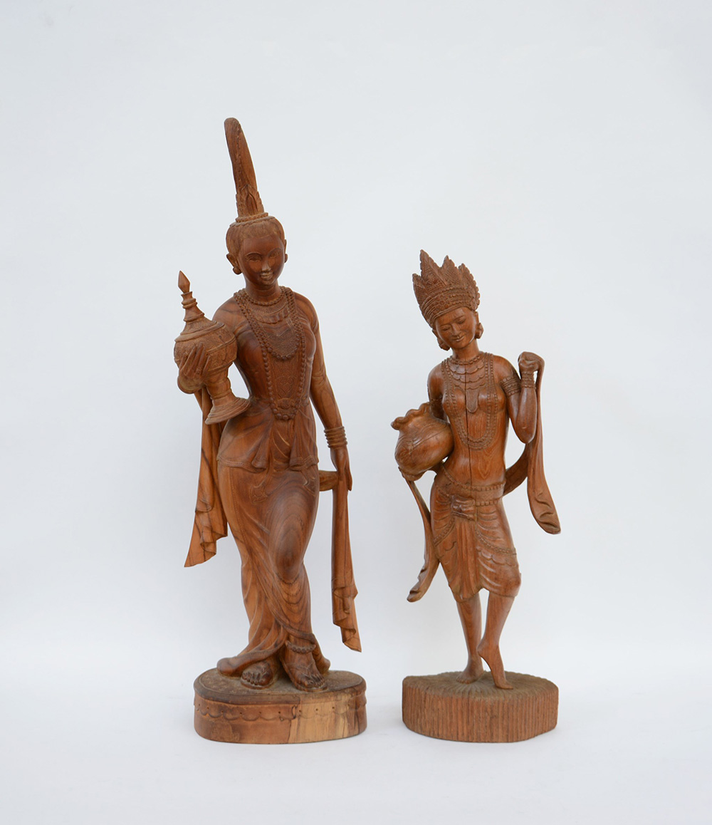 Lotto composto da due sculture lignee raffiguranti divinità orientali, misure diverse (difetti)