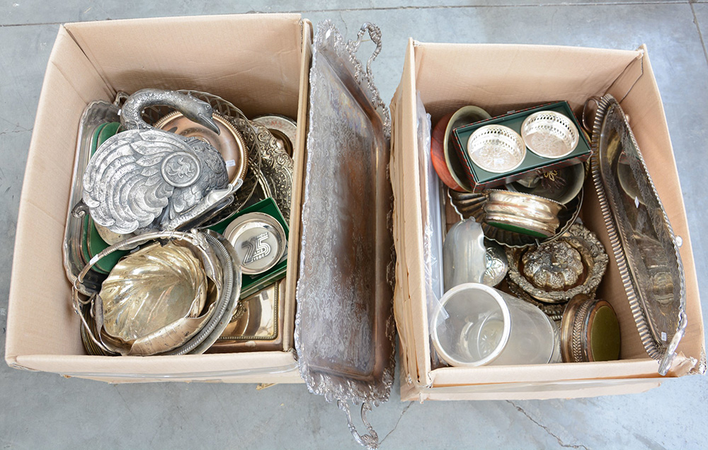 Lotto composto da numerosi oggetti in metallo argentato e metallo (difetti)(lotto contenuto in scatole)