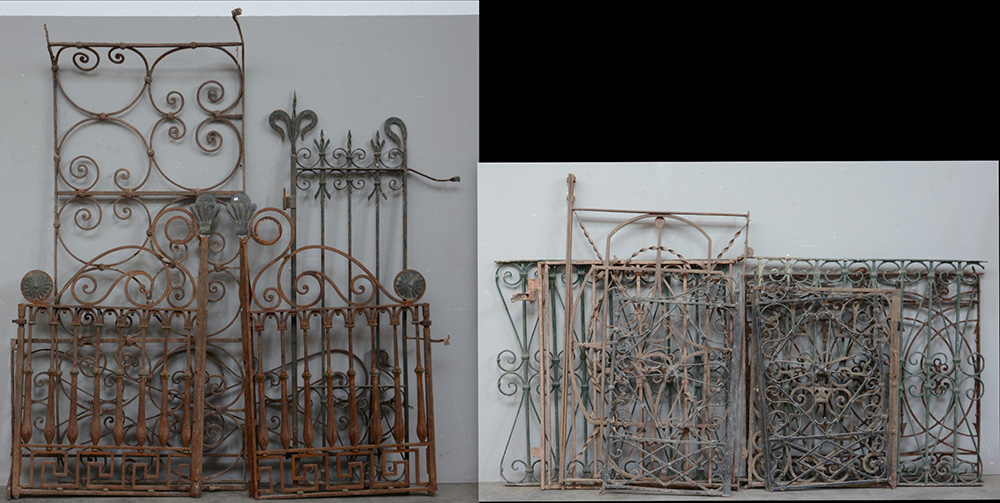 Lotto composto da sette inferriate, due cancelletti a due ante e due cancelletti ad anta unica in ferro battuto di epoche diverse (difetti)