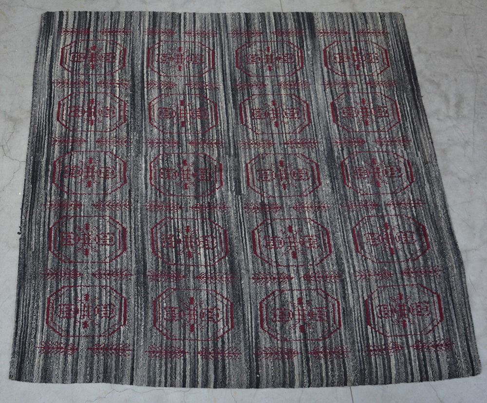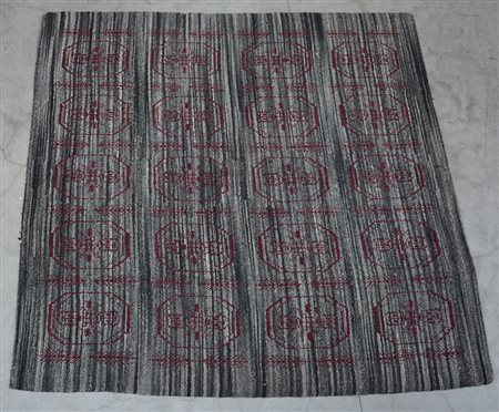 (Tappeto) Tappeto Bouclé, Sec. XX tessuto in lana grigia mélange con decorazione bordeaux di ispirazione mediorientale (difetti) (cm 245x245)