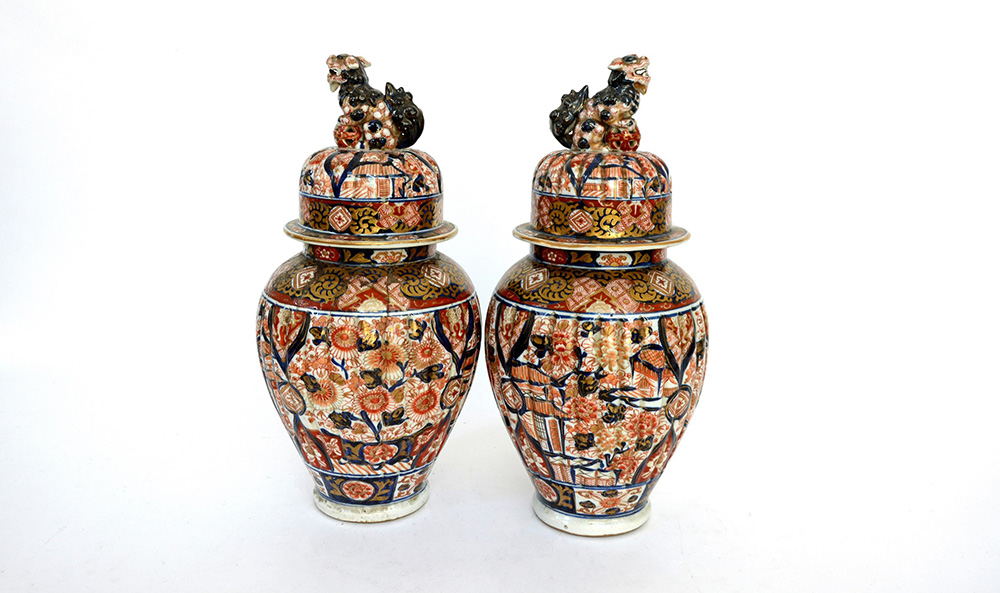 Manifattura giapponese. Coppia di potiche in porcellana policroma con coperchio (h cm 38) (difetti e restauri)