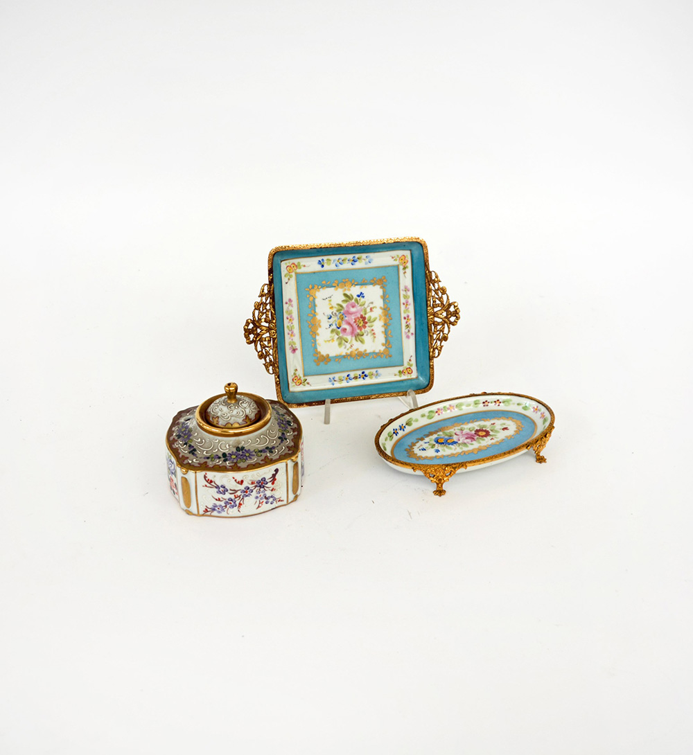 Manifattura francese, lotto composto da un calamaio e due vassoietti in porcellana policroma e metallo dorato (difetti)