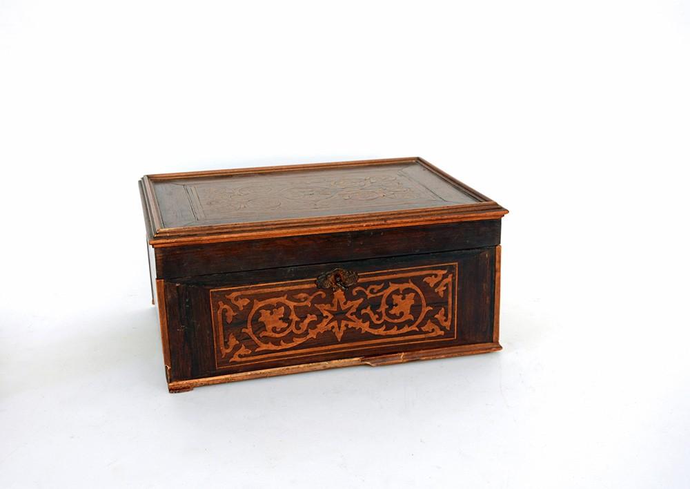 Scatola con coperchio in legno intarsiato a motivi vegetali, fine sec XIX (difetti e mancanze)