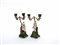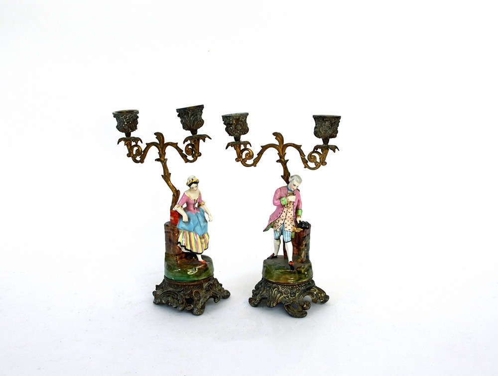 Coppia di candelieri in metallo a due fiamme con fusto formato da due sculture in porcellana policroma raffiguranti gentildonna e gentiluomo (h cm 27)(difetti)