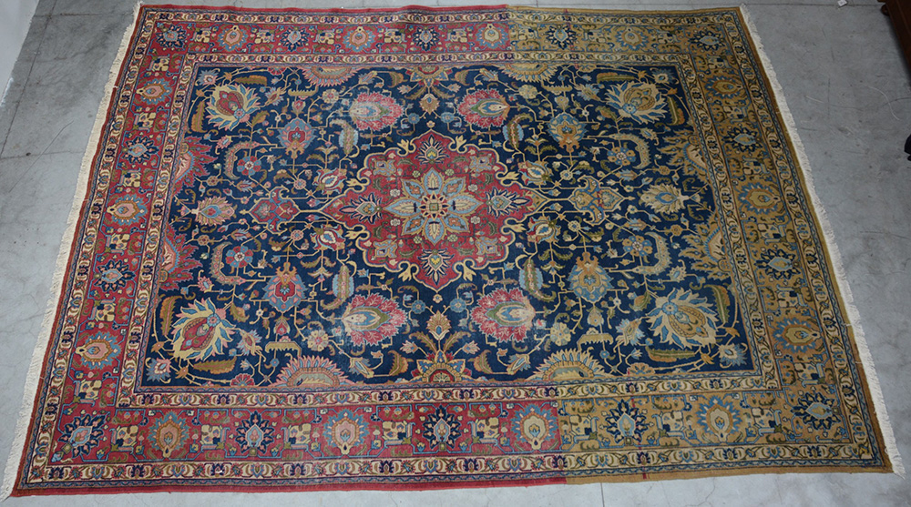 [Tappeti] Tappeto Joravan, Persia, sec. XX. Disegno a medaglione nei toni del rosso, azzurro e beige su fondo blu (cm 410x305)(difetti e mancanze Abrash)