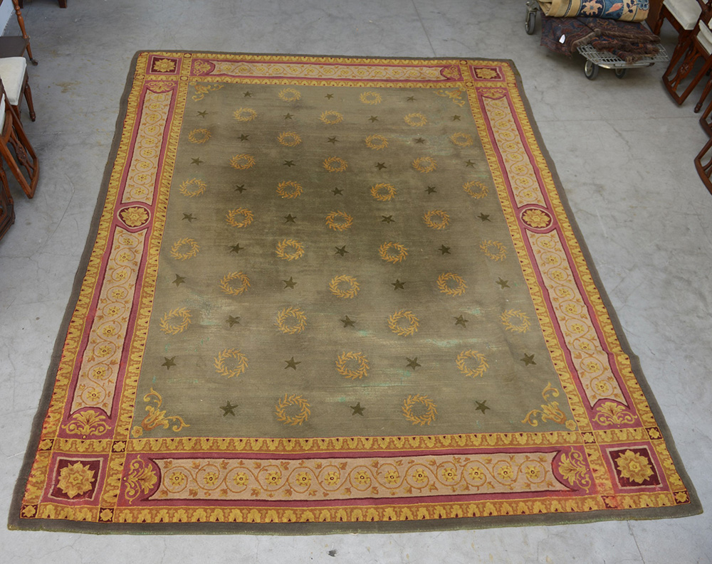 [Tappeti] Tappeto europeo, sec. XIX. Campo decorato con ghirlande e stelle nei toni del giallo e verde scuro. Bordure nei toni del giallo, ocra, bordeaux, rosa e beige (384x292 cm)(difetti)