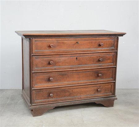 Cassettone in noce a quattro cassetti riquadrati, piedi a mensola, sec XVII...