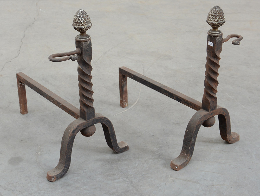 Coppia di alari in ferro battuto con pomoli in bronzo a forma di pigna, sec XIX (difetti)