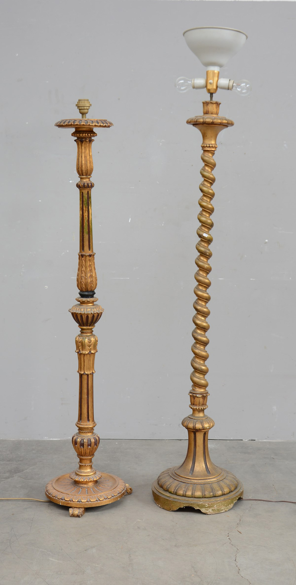 Lotto di due lampade da terra in legno dorato, intagliato e tornito (misure diverse) (difetti)
