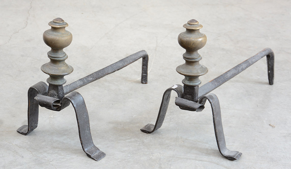 Coppia di alari in ferro battuto con pomoli in bronzo (difetti)
