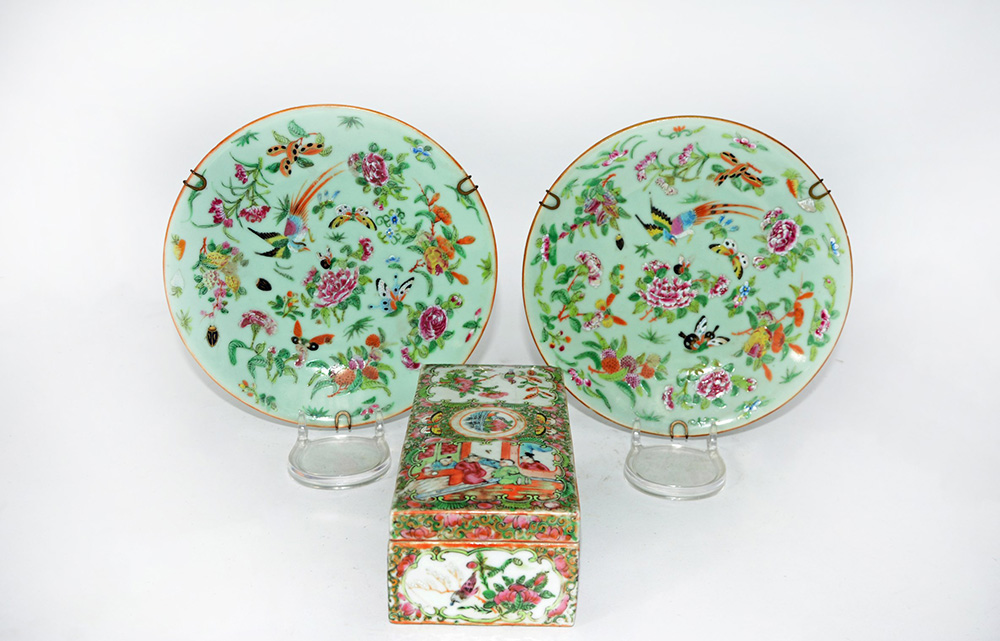 Lotto composto da una scatola rettangolare in porcellana Famiglia Rosa cantonese con decorazione floreale e figure, unita ad una coppia di piatti in porcellana decorata a fiori ed uccelli su fondo turchese (difetti e restauri) Cina, sec. XIX (l max cm 19; d max cm 22)