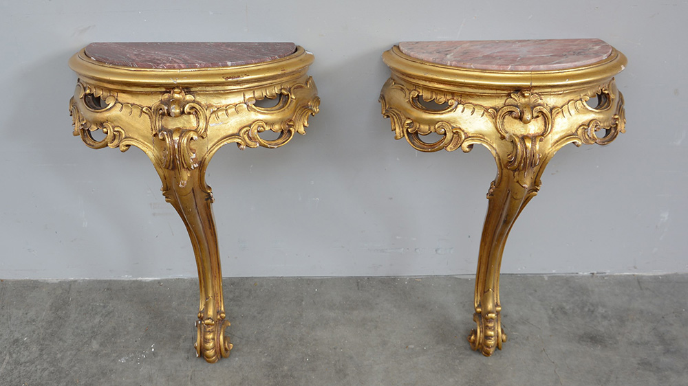 Coppia di mensole a goccia in legno intagliato e dorato (cm 100x53x55) (difetti)