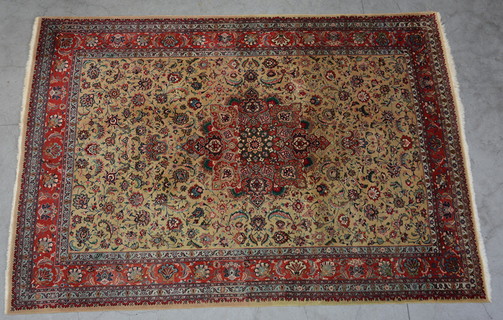 [Tappeti] Tappeto Tabriz, Persia, sec. XX. Disegno a medaglione policromo su campo color beige decorato con rami fioriti (cm 280x200)(difetti)
