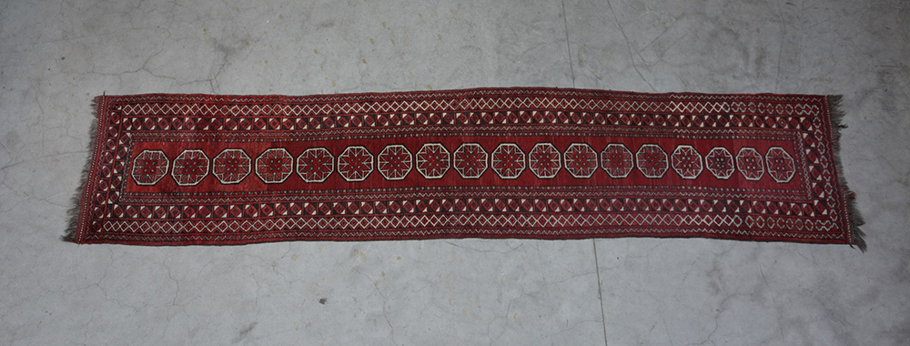 [Tappeti] Tappeto-passatoia Afghan, Turkestan occidentale, sec. XX. Disegno a Boulder nei toni del bianco e rosso su fondo rosso (cm 369x78)(difetti)