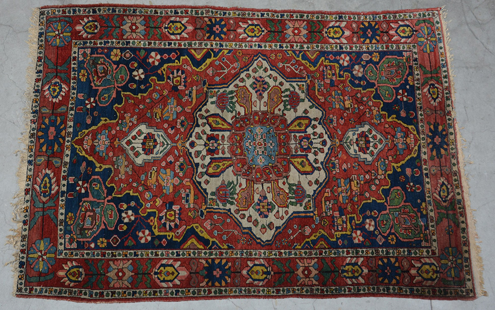 [Tappeti] Tappeto Bachtiar, Persia, sec. XX. Disegno a medaglione con decoro policromo su fondo bianco. Campo color rosso e angolari a fondo blu (cm 208x148)(difetti)