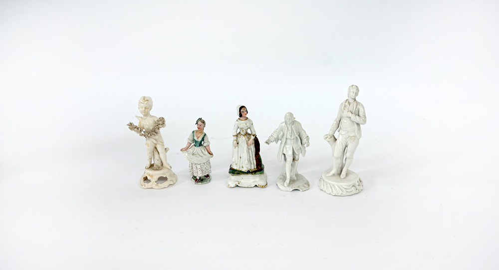Manifatture diverse, lotto composto da cinque sculturine in porcellana e ceramica bianca e policroma raffiguranti gentiluomini, gentildonne e putto (difetti)