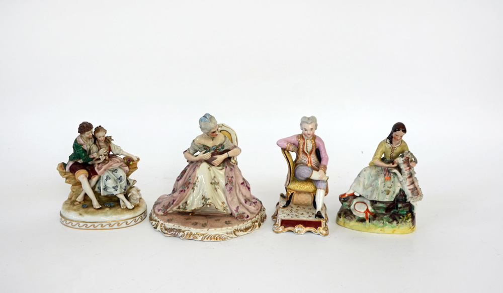 Manifatture diverse, lotto composto da quattro sculture in porcellana policroma raffiguranti gentildonna, gentiluomo, pastorella e scena galante (difetti)