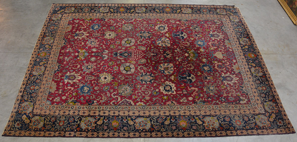 Tappeto Tabriz, Persia secolo XX. Disegno all.over floreale policromo su fondo rosso rubino, bordura Herati (cm 408x326) (difetti)